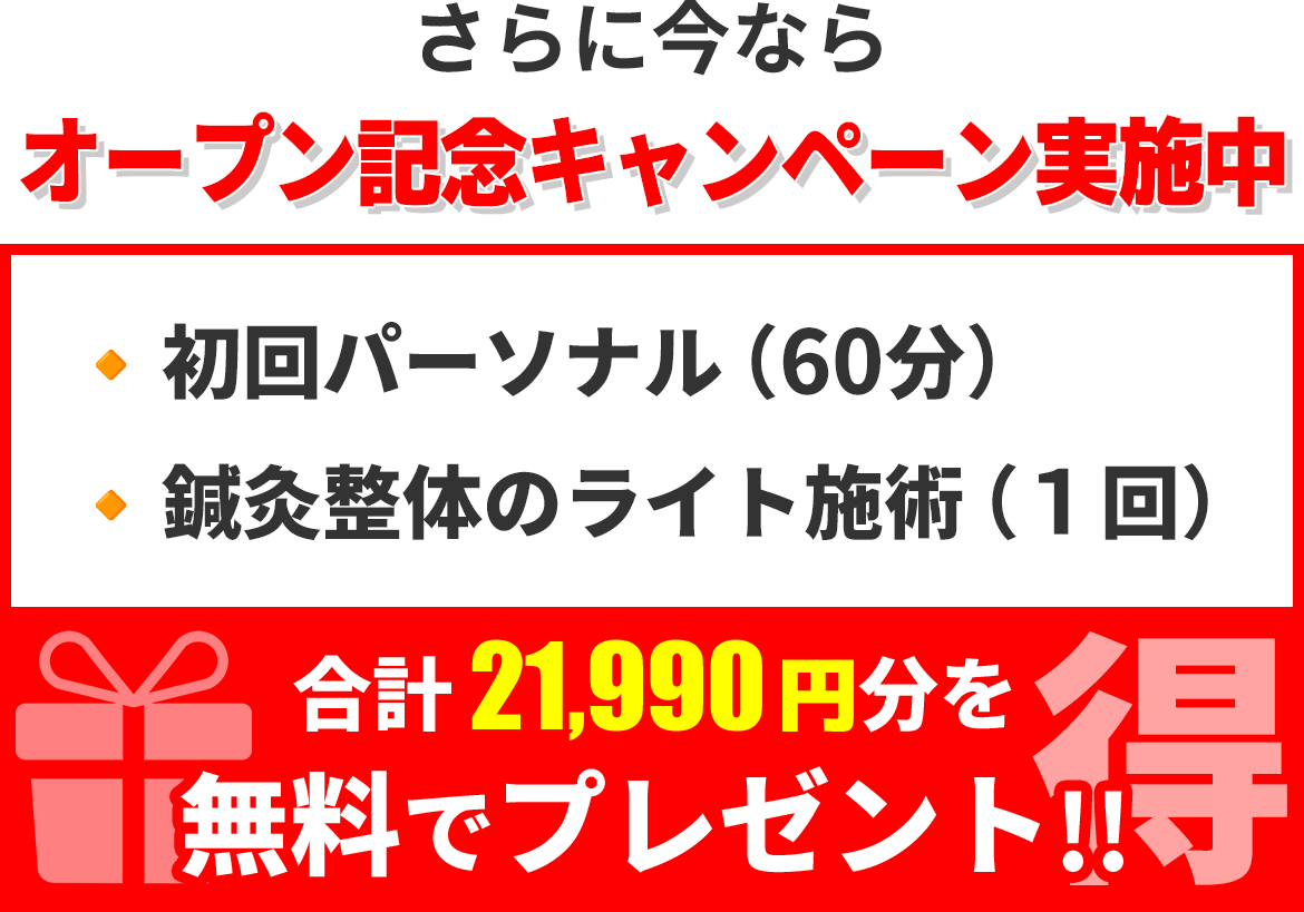店舗内に整体院を併設しておりますので、身体の『痛み』『痺れ』『歪み』『コリ』など様々なお悩みを解決することが可能です。また、運動前後のケアにもおすすめです。
